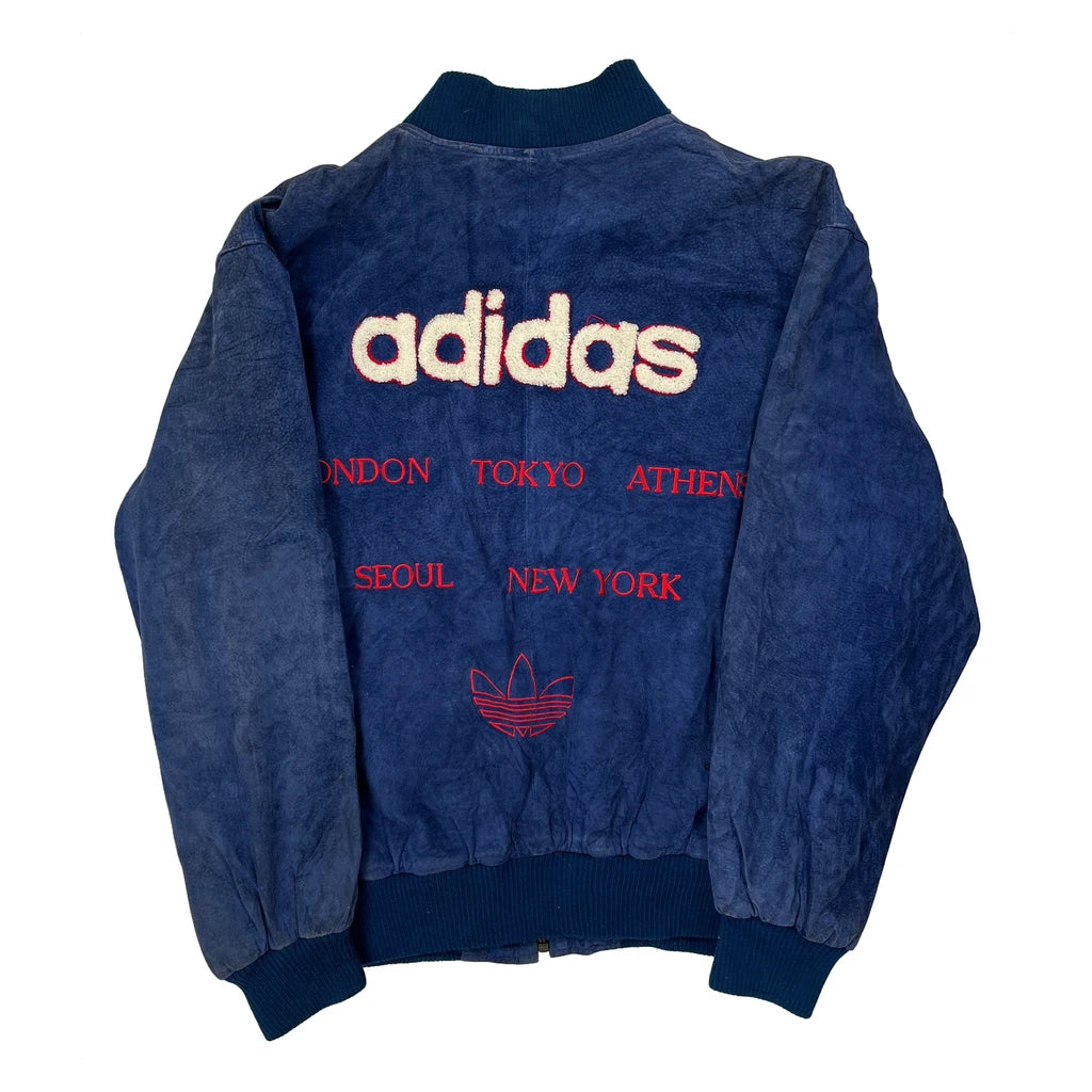 1980S Adidas Spellout Bomber Jacket - Small Blue Suede