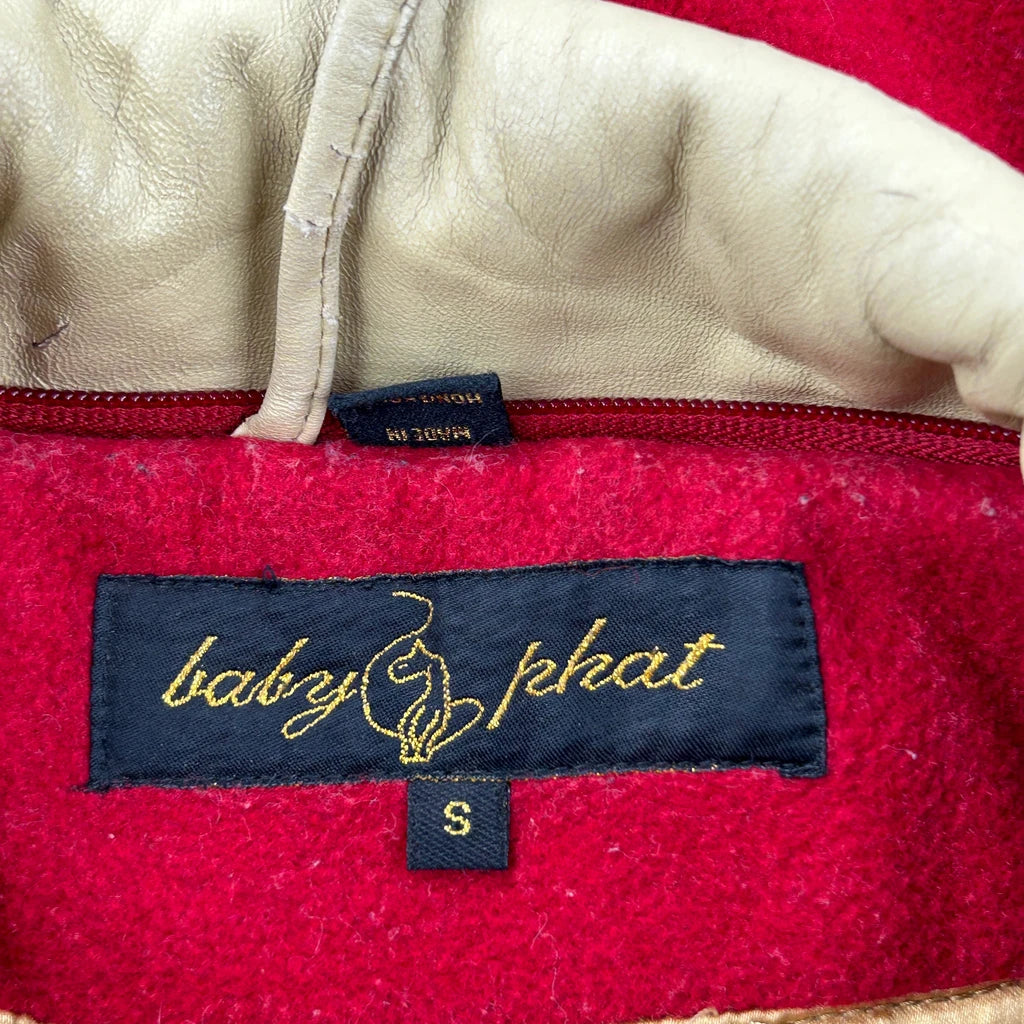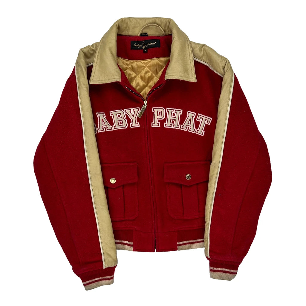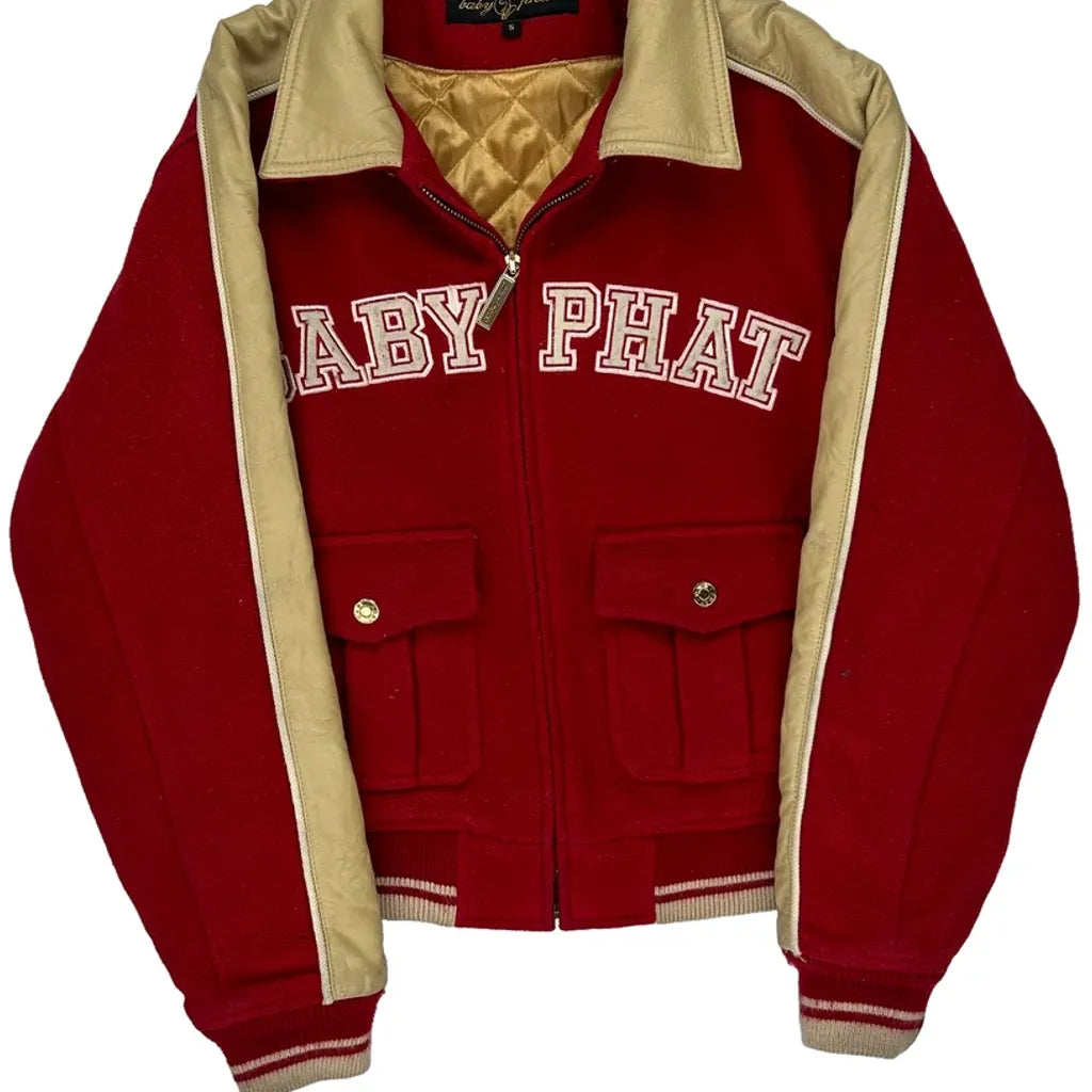 Baby Phat Red And Beige Varsity Jacket With Spellout Logo On Front And Embroidered Logo On Back.