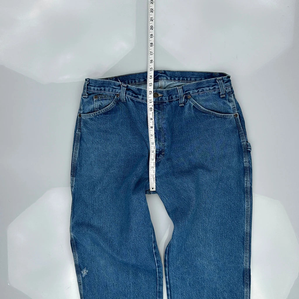 Dickies Carpenter Jeans, fit a 35″ Waist and 32″ inseam.