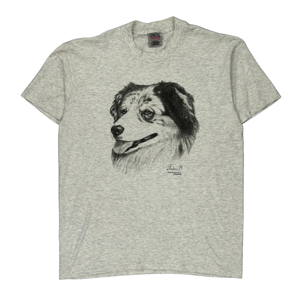Dog Print Oneita Single Stitch T-Shirt - Large Grey Cotton Blend