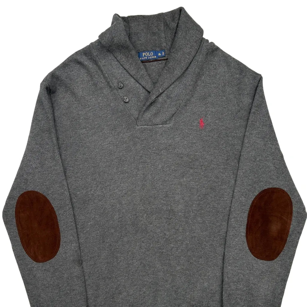 Grey Long Sleeve T-Shirt With Shawl Collar And Elbow Patches.