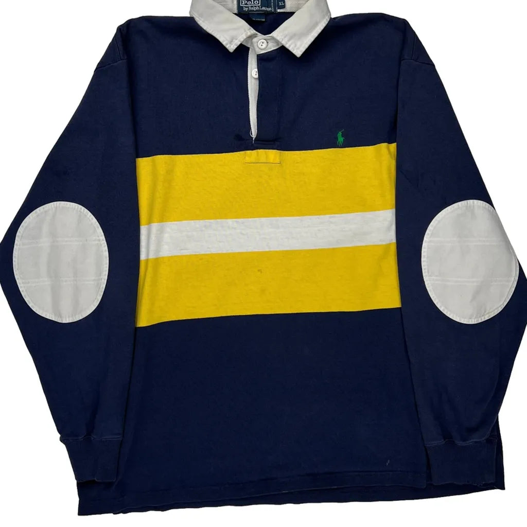 Navy Rugby Shirt With Yellow And White Stripes, Elbow Patches