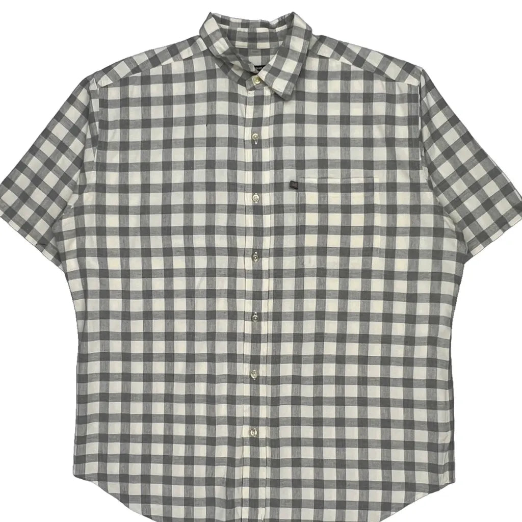 Grey And White Checked Pattern, Short Sleeve, Button-Down Shirt