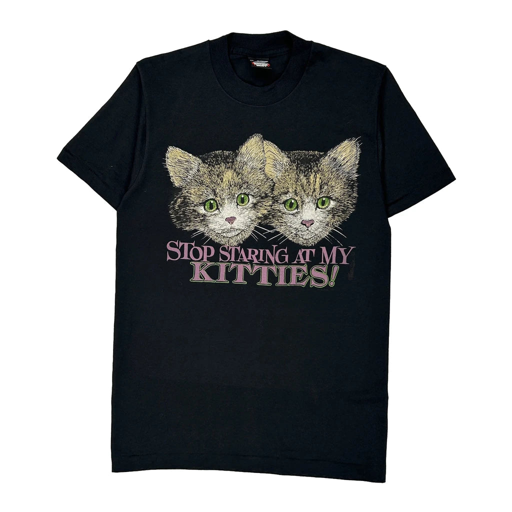 Black T-Shirt With A Graphic Of Three Kittens And The Text 'Stop Staring At My Kitties!'