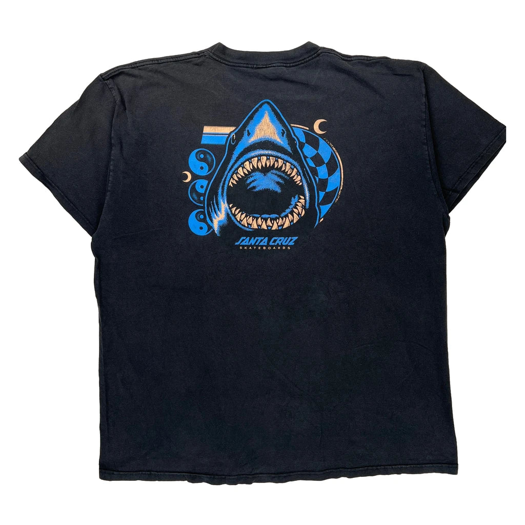 Black T-Shirt With Santa Cruz Skateboards Logo And Shark Graphic On The Back.