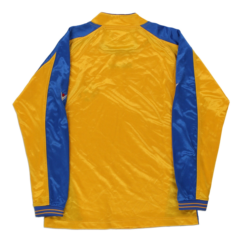 Vintage Age 14 yellow Macron football shirt, fits xx-small.